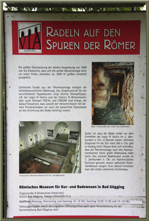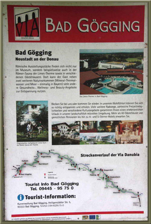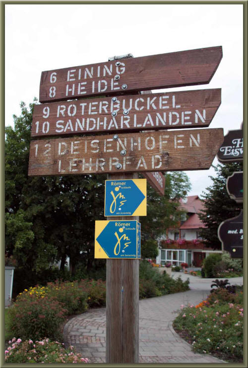 Die Römerschlaufe beginnt in Eining am direkt an der Donau gelegenen Biergarten. Hier besteht auch die Möglichkeit, per Seilfähre auf nostalgische Weise über die Donau zu setzen - wichtig vor allem für diejenigen, die aus Richtung Weltenburg via Donau-Schlaufe zu diesem gewisssermaßen kulinarischen Knotenpunkt gelangen wollen. Vom Biergarten führt die Römerschlaufe zunächst an der Abens entlang, die hier in die Donau mündet. Über einen kurzen, steilen Aufstieg gelangt man hinauf in die Ortschaft mit ihrer weithin sichtbaren Kirche. Das eigentliche kulturelle Highlight Einings aber ist das Römerkastell Abusina. Es ist die einzige in ihrem Mauerbestand vollständig freigelegte und konservierte römische Wehranlage in Bayern. Vom Römerkastell, das in römischer Zeit den östlichen Riegel des Limes markierte, führt die Römerschlaufe weiter in Richtung Sittling. Entlang der Hangkante bieten sich herrliche Blicke auf Abens und Donau. Entlang des Hochwasserdammes führt der Weg hinein in den Kurort Bad Gögging. Im alten Ortskern empfiehlt sich ein kurzer Abstecher zur romanischen Andreaskirche mit dem Römermuseum oder zu einer der zahlreichen Gaststätten. Wellnessfreunden sei ein Besuch der Limes-Therme wärmstens empfohlen. Vorbei an den für die Hallertau typischen Hopfengärten verlässt man Bad Gögging in Richtung Sandharlanden. Ein Kleinod auf dem Weg zum Sandberg stellt das Naturschutzgebiet Sandharlandener Heide mit seinen eiszeitlichen Flugsanden und einer reichhaltigen Pflanzenwelt dar. Auf der Westseite des Sandberges führt der Weg an weitläufigen Trockenhängen entlang, mit Blick in das Donautal und den Duft vom Thymian und Kiefernharz in der Nase. Mit sanftem Gefälle geht es schließlich wieder hinunter zur Donau. Flussaufwärts erreicht man nach einem Kilometer schließlich wieder den Ausgangspunkt.