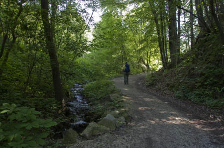 Entlang eines Bächleins durch den Wald wandern wir und möchten den Schutzfelsen und die Aussicht von oben betrachten |